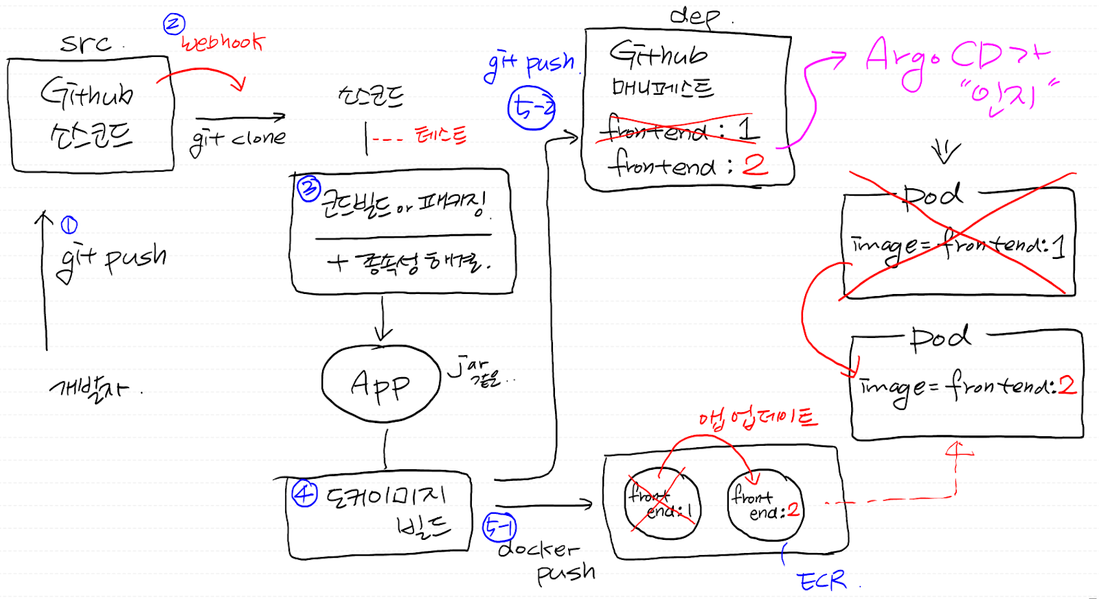 ArgoCD를 설치후 dep 레포지토리를 등록하고, 소스레포에 변경사항을 발생하여 앱이 업데이트가 되는지를 확인