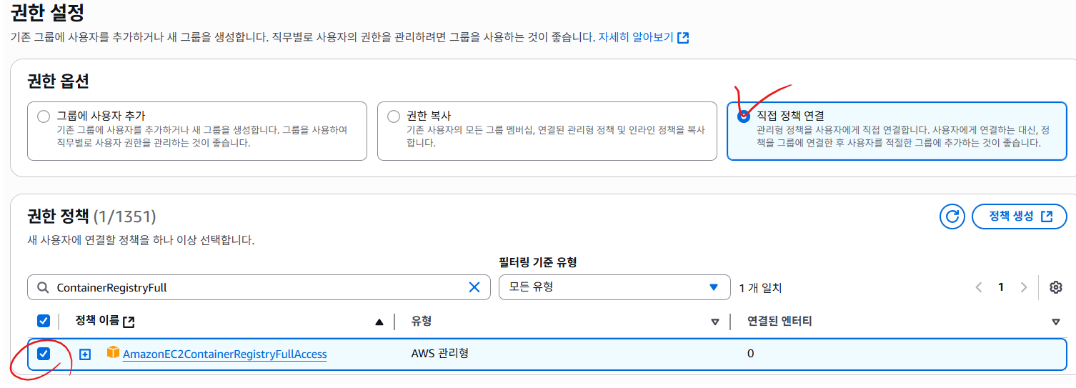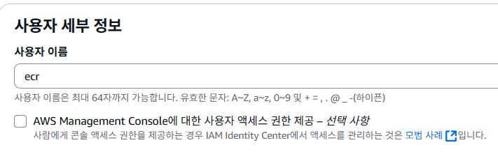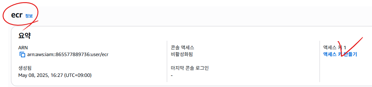 # 다음 절차는 ECR에 push를 하기 위한 계정을 등록할건데, ECR에 접근할 수 있는 최소한의 권한만 갖고있는 계정을 생성해서 등록하는게 베스트다. (절대 administrator 권한은 주지마세요!!)